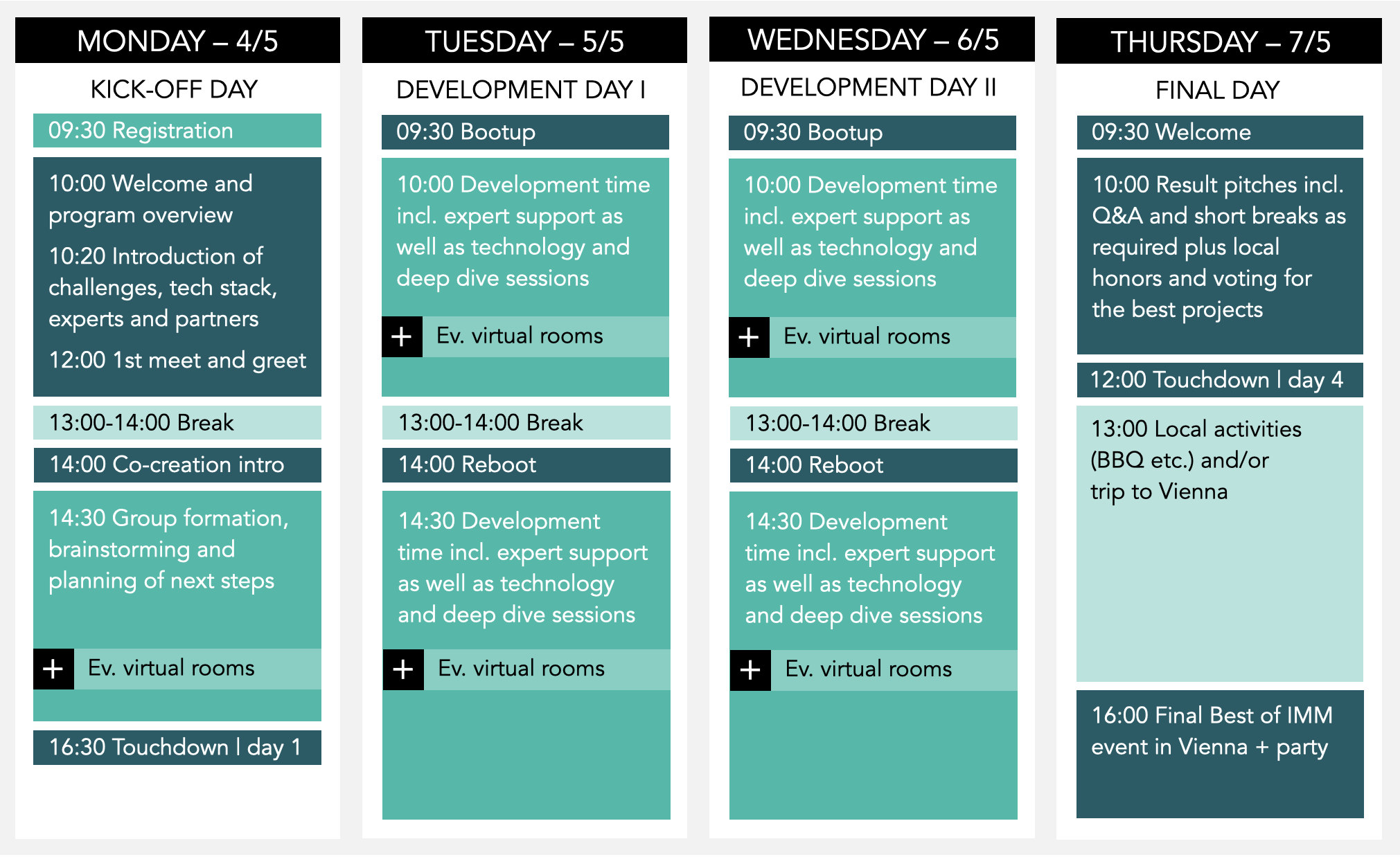 These two days are dedicated to hands-on development, prototyping, and testing, with flexible working times following the hop-on/hop-off principle.